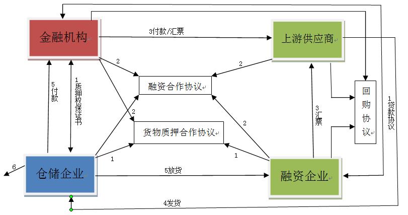 2.根據(jù)融資企業(yè)所提交的購銷合同,金融機(jī)構(gòu)、融資企業(yè)與上游供貨商三方簽訂《貨物回購協(xié)議》,金融機(jī)構(gòu)、融資企業(yè)、上游供貨商和倉儲企業(yè)四方簽訂《融資合作協(xié)議》,融資企業(yè)向金融機(jī)構(gòu)繳納一定的保證金,金融機(jī)構(gòu)(主要指商業(yè)銀行)開出銀行承兌匯票,將銀行承兌匯票交由融資企業(yè)(此處并非一定是銀行匯票,也可以資金的形式等)。